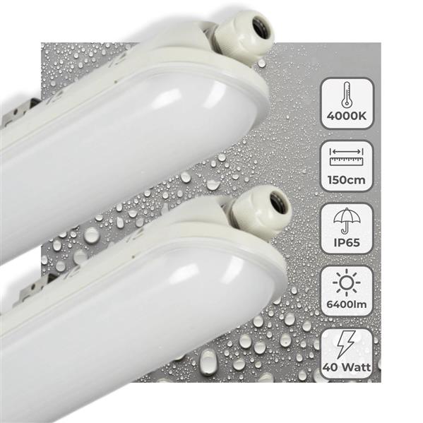 Dit LED TL armatuur compleet met 150cm lengte is de perfecte professionele verlichtingsoplossing voor vochtige en veeleisende omgevingen. Met een verbruik van slechts 40W levert het armatuur een krachtige lichtstroom van 6400 lumen, ideaal voor grote werkplaatsen, magazijnen, sporthallen of andere ruimtes waar je veel helder en betrouwbaar licht nodig hebt. Dit armatuur vervangt een traditionele 280W halogeen lamp. De IP65 classificatie maakt dit armatuur volledig waterdicht en geschikt voor gebruik in vochtige ruimtes. Deze set bevat 2 stuks voor een voordelige prijs.