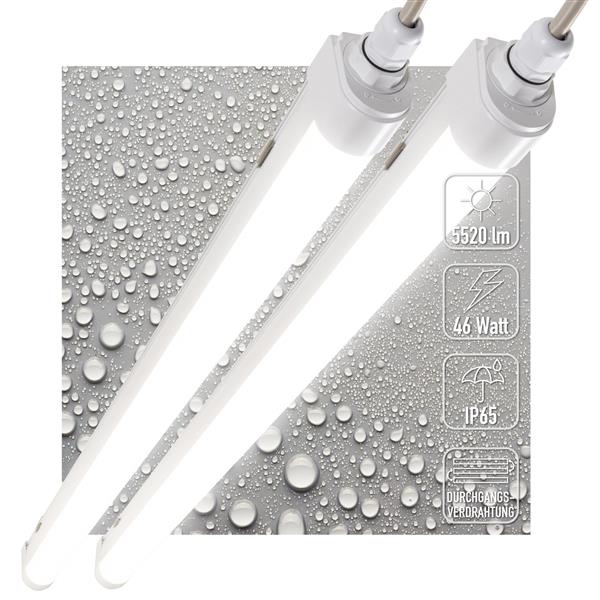 Dit waterdichte LED TL armatuur van 5520 lumen vervangt een traditionele TL-buis van 150cm met ongeveer 450-550 watt. Met IP65 bescherming is dit armatuur geschikt voor vochtige en stoffige omgevingen zoals parkeergarages, werkplaatsen en opslagruimtes. De voordeelverpakking bevat 2 armaturen.
