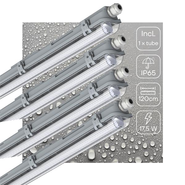 Deze waterdichte LED TL armatuur van 120 cm levert 1800 lumen helder koelwit licht en vervangt traditionele 150-180W verlichting. Met slechts 17.5W verbruik, volledige IP65 bescherming en IK06 slagvastheid is dit de ideale oplossing voor kantoren, werkplaatsen, garages en buitenruimtes waar je betrouwbare verlichting nodig hebt.