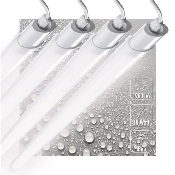 Dit compacte LED TL-armatuur van 120 cm levert 1900 lumen helder koelwit licht en vervangt traditionele verlichting van 190 watt of halogeen van 127 watt. Met slechts 18 watt verbruik en een lichtopbrengst van 106 lumen per watt krijg je efficiënte verlichting voor een scherpe prijs. Dankzij de IP65 -classificatie is dit armatuur volledig beschermd tegen stof en waterstralen, waardoor je het zowel binnen als buiten kunt gebruiken. De IK08 -classificatie zorgt voor extra bescherming tegen zware stoten. Met een gewicht van slechts 225 gram per armatuur is dit een van de lichtste waterdichte armaturen op de markt, ideaal voor snelle en eenvoudige installatie.