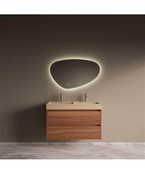 De wastafel geeft een mooi contrast met het meubel. Deze is gemaakt van Travertin, een prachtig natuursteen met een lichte tint. Om ervoor de te zorgen dat de natuursteen op lange termijn het mooie uiterlijk behoudt, is het belangrijk de natuursteen te impregneren. Door dit 1 of 2 keer per jaar te doen zal deze goed beschermd blijven tegen water, vuil en andere risico's.