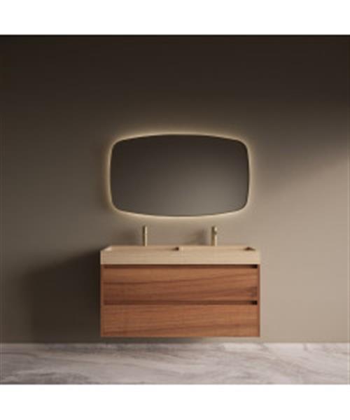 De wastafel geeft een mooi contrast met het meubel. Deze is gemaakt van Travertin, een prachtig natuursteen met een lichte tint. Om ervoor de te zorgen dat de natuursteen op lange termijn het mooie uiterlijk behoudt, is het belangrijk de natuursteen te impregneren. Door dit 1 of 2 keer per jaar te doen zal deze goed beschermd blijven tegen water, vuil en andere risico's.