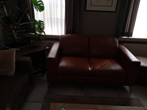 Kenmerken: Kleur: Bruin, Materiaal: Leer, Soort bank: Bankstel, Staat: Zo goed als nieuw, Kopen in Temse
