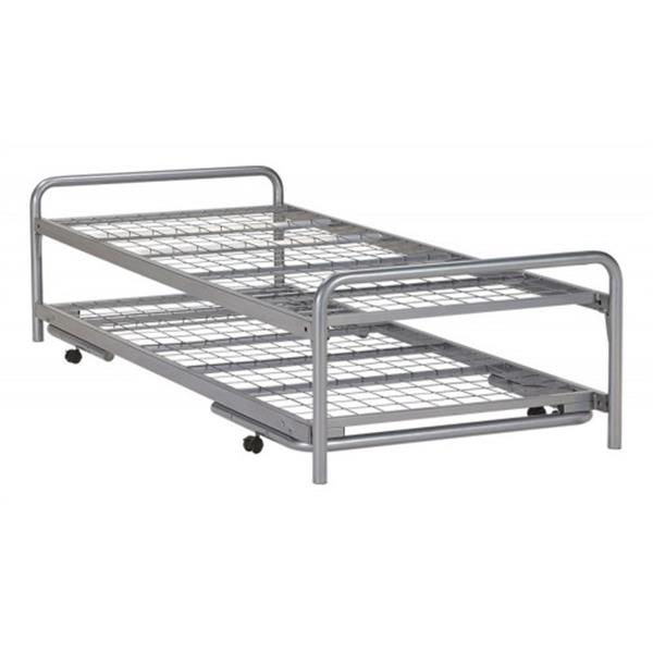 De Dubbel divan neemt evenveel ruimte in als een eenpersoonsbed, maar kan eenvoudig worden uitgeschoven tot een tweepersoons slaapplaats. Of het nu gaat om een gezellig avondje met vrienden, het bezoek van verre familie of logeerpartijtjes van vriendjes en vriendinnetjes van je kinderen, het kan allemaal. Dit ruimtebesparende bed biedt in een handomdraai één of twee royale slaapplaatsen!Kenmerken:Kleur: zilverBodem: hoogwaardig rasterUitschuifbaar bed met wieltjesBoven- en onderbed zijn even hoog.