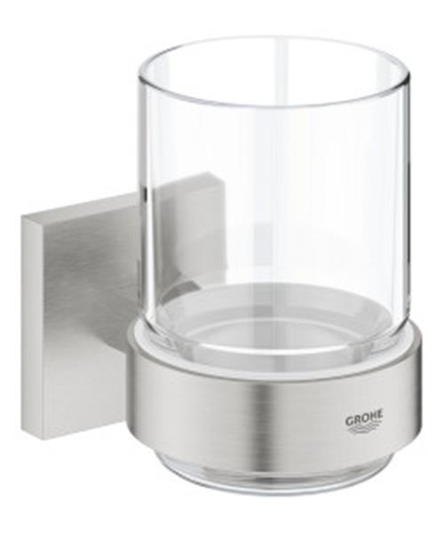 Een minimalistisch design en verrassend eenvoudig te monteren! Dat is het GROHE Start Cube glas met houder, waarmee je de stijl en het comfort van de badkamer in een handomdraai een boost kunt geven, zodat tandenpoetsen ineens veel aangenamer wordt. Het heeft een roestvrijstalen uiterlijk en is in Duitsland vervaardigd van de beste materialen, waardoor het perfect past in elke moderne badkamer. En dankzij de verborgen bevestiging heeft het een prachtige afwerking die er echt professioneel uitziet. De houder is ook voorzien van een GROHE Long-Life Shine PVD-afwerking: een extra duurzame, gemakkelijk te reinigen coating die een tien keer hogere krasbestendigheid biedt dan gewoon chroom. Maar vergeet vooral niet hoe eenvoudig het is om te monteren! Het kan gewoon aan de muur worden vastgeschroefd (schroeven en deuvels zijn inbegrepen) of, om het nog gemakkelijker te maken, kan het ook worden vastgelijmd! Het enige dat je nodig hebt, is GROHE QuickGlue (voor één montageplaat 41127000, apart verkrijgbaar). Raadpleeg onze QuickGuide en QuickVideo om te zien hoe eenvoudig het is om te monteren. Er is ook een reserveglas beschikbaar (41184000). En als je graag een harmonieus badkamerontwerp wilt creëren, bekijk dan onze bijbehorende accessoires zoals de toiletrolhouder, toiletborstelset, badjashaak, handdoekring, handdoekhouder en hoekdouchemand.