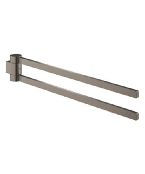 De GROHE Selection handdoekhouder in hard graphite geborsteld (mat donkergrijs) combineert design met functionaliteit. Met de GROHE Selection handdoekhouder zijn rondslingerende handdoeken in de badkamer verleden tijd. De handdoekhouder is voorzien van twee draaibare stangen waardoor je zowel kleine als grote handdoeken makkelijk kunt ophangen. De scharniervering is zo stevig dat je verzekerd bent van een veilige en degelijke wandmontage. Ook natte handdoeken die wat zwaarder zijn kan de handdoekhouder makkelijk dragen. Het badkameraccessoire monteer je met een verborgen bevestiging waardoor het slanke design mooi behouden blijft. De montage gaat bovendien snel en eenvoudig met het slimme GROHE FastFixation installatiesysteem. De accessoires van GROHE Selection zijn goed te combineren met andere items uit de collectie. Zo kun je de dubbele handdoekhouder stijlvol aanvullen met een zeepdispenser, spoelglas en make-up spiegel in dezelfde kleur.