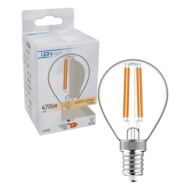 Deze LED filament lamp met E14 fitting en klassieke G45 kogelvorm combineert retro uitstraling met moderne LED technologie. Met een verbruik van slechts 4.5W levert de lamp een warme lichtstroom van 470 lumen, vergelijkbaar met een traditionele 40W gloeilamp. Deze lamp vervangt een traditionele 40W halogeen lamp. Het heldere glas en zichtbare LED filament geven de lamp een authentieke vintage uitstraling, perfect voor decoratieve armaturen. Met een zeer brede stralingshoek van 330° verspreidt het licht zich in alle richtingen.