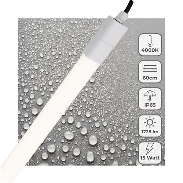 Dit vochtbestendige LED TL-armatuur van 60 cm levert 1725 lumen helder koelwit licht en vervangt traditionele verlichting van 172 watt of halogeen van 115 watt. Met slechts 15 watt verbruik bespaar je direct op je energiekosten, terwijl je profiteert van een levensduur van maar liefst 25.000 branduren. Dankzij de IP65 -classificatie is dit armatuur volledig beschermd tegen stof en waterstralen, waardoor je het zowel binnen als buiten kunt gebruiken.
