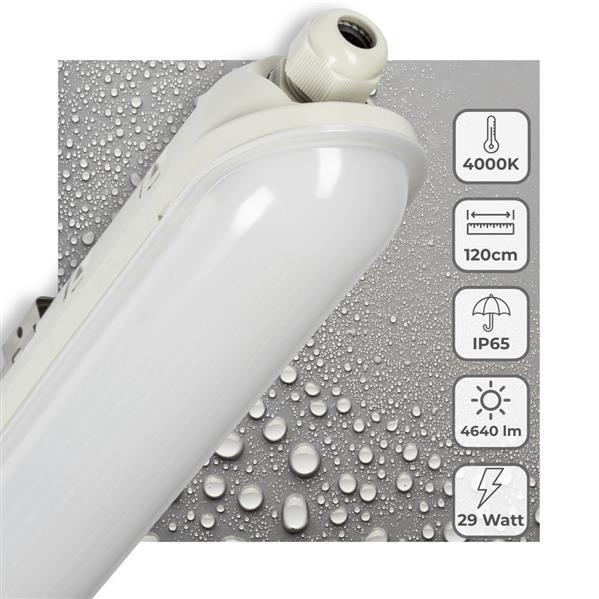 Dit LED TL armatuur compleet met 120cm lengte is de perfecte professionele verlichtingsoplossing voor vochtige en veeleisende omgevingen. Met een verbruik van slechts 29W levert het armatuur een krachtige lichtstroom van 4640 lumen, ideaal voor werkplaatsen, garages, magazijnen of andere ruimtes waar je helder en betrouwbaar licht nodig hebt. Dit armatuur vervangt een traditionele 200W halogeen lamp. De IP65 classificatie maakt dit armatuur volledig waterdicht en geschikt voor gebruik in vochtige ruimtes.