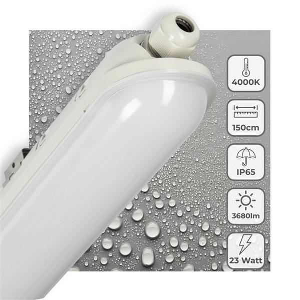 Dit complete LED TL armatuur van 150cm levert maar liefst 3680 lumen helder koelwit licht en is perfect voor professioneel gebruik in werkplaatsen, magazijnen, garages en vochtige ruimtes. Met een verbruik van slechts 23W en een uitzonderlijke efficiëntie van 160 lumen per watt is dit een van de meest energiezuinige armaturen beschikbaar. De IP65 bescherming en IK08 slagvastheid maken dit armatuur geschikt voor de zwaarste omstandigheden, zowel binnen als buiten.