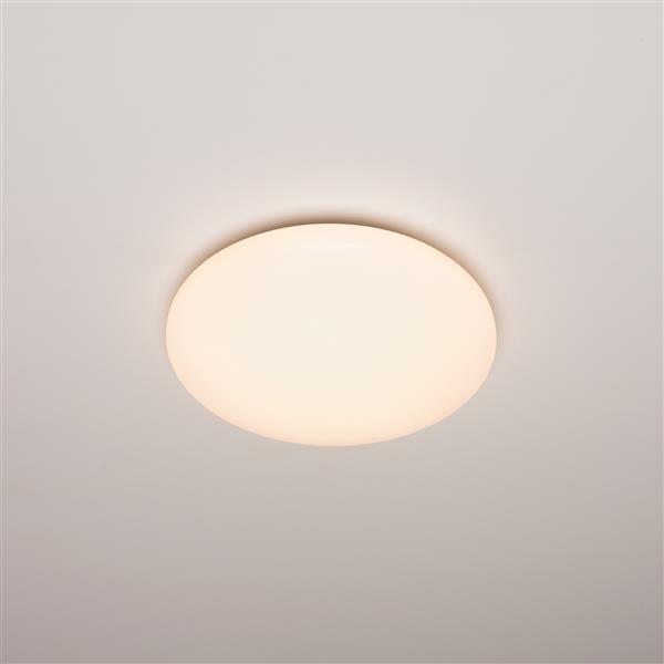 Deze LED plafondlamp van 27cm diameter is perfect voor badkamers, toiletten, gangen en andere ruimtes. De lamp vervangt traditionele 70W verlichting en levert 850 lumen (1160 lumen bruikbaar) warmwit licht, terwijl hij slechts 12W verbruikt. Met een lichtopbrengst van 96 lumen per watt is deze plafondlamp zeer energiezuinig. De lamp heeft IP44 bescherming en is spatwaterdicht.