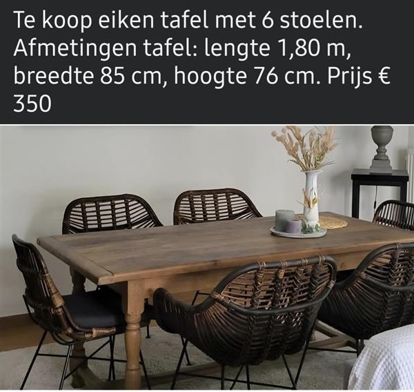 Te koop, vol- eiken tafel met 6 stoelen in perfecte staat.
